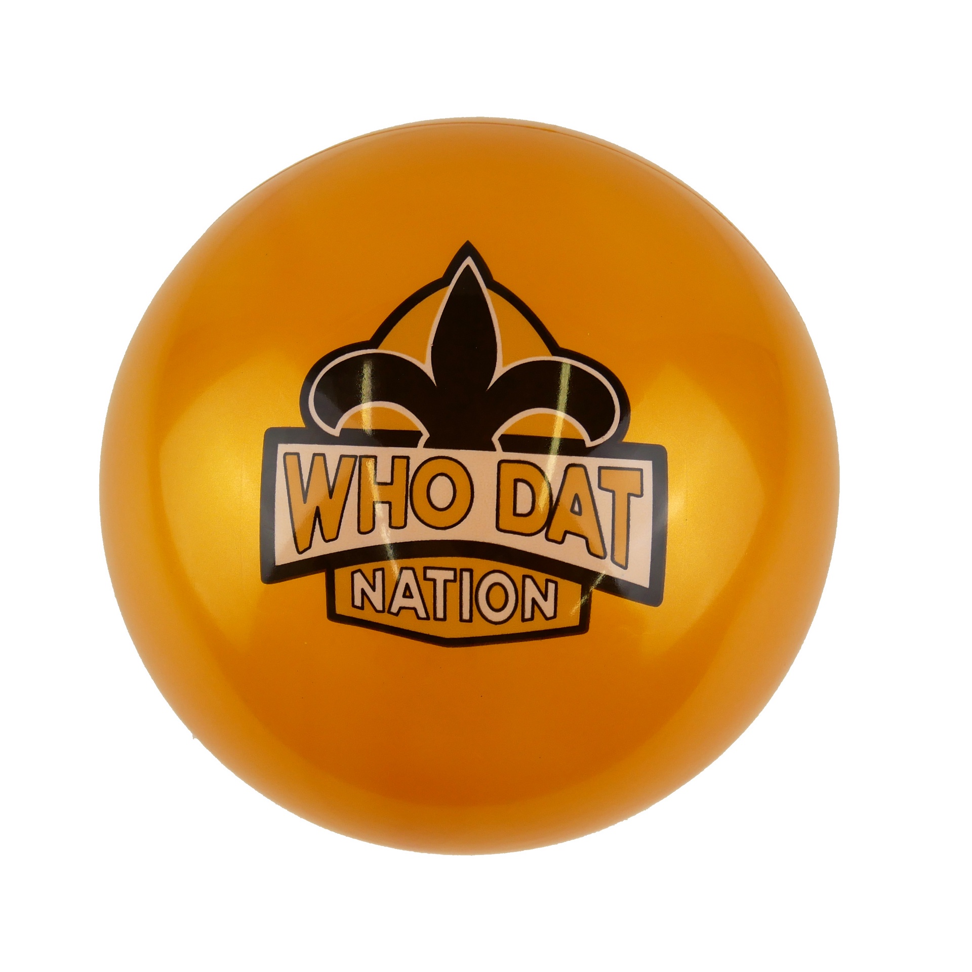 8" Gold inflated rubber ball with black and gold fleur di lis and who dat nation logo.
