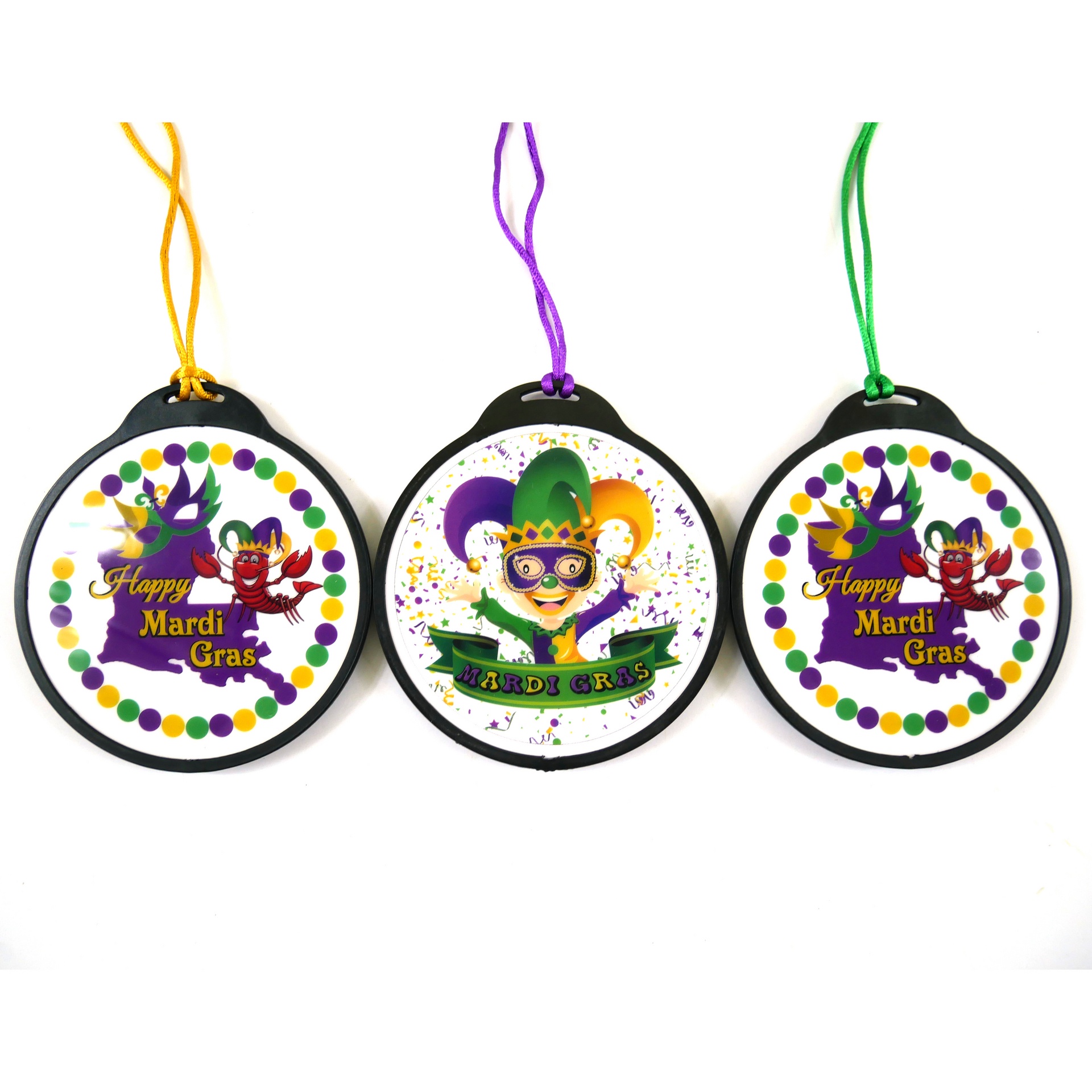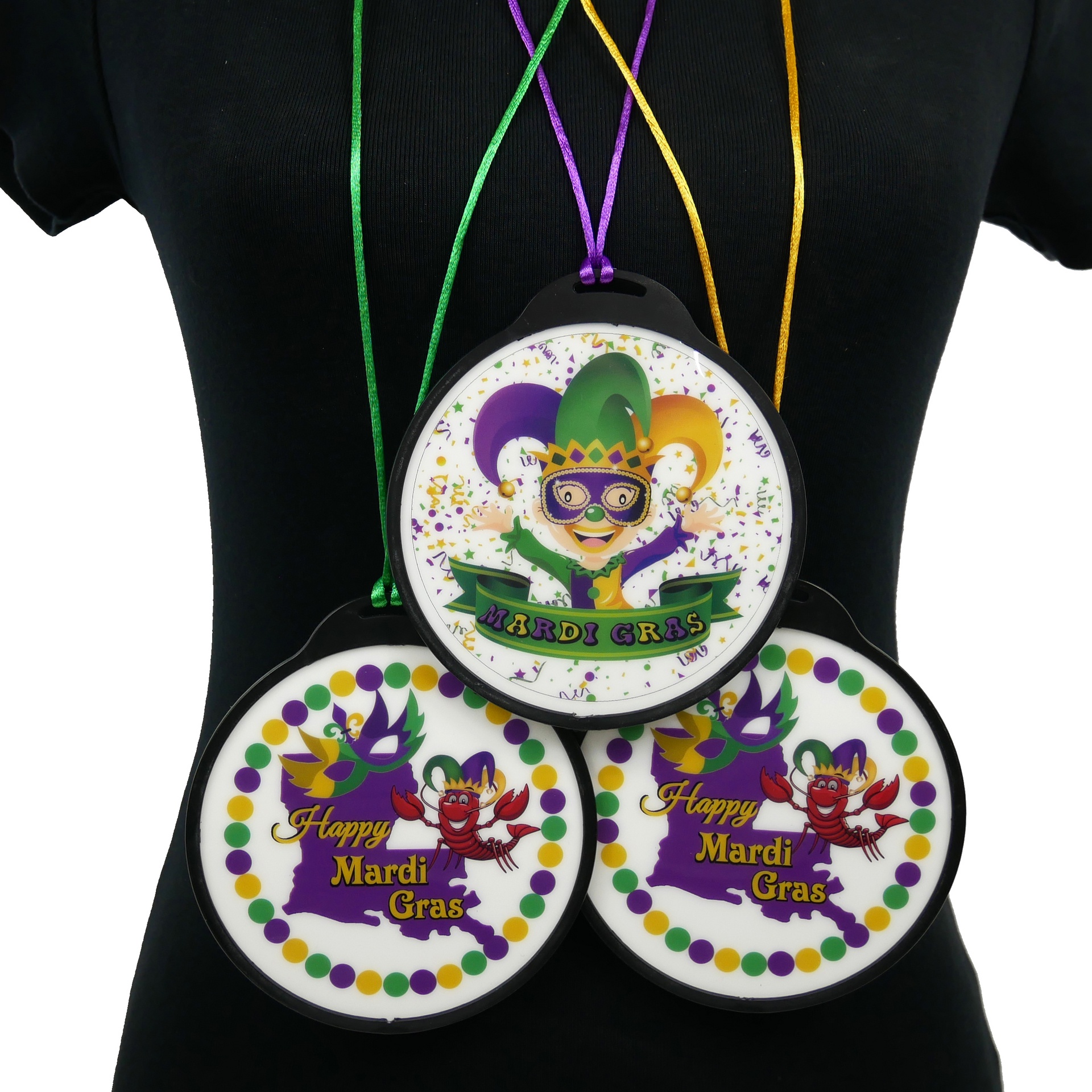 4.5" LED round back lit disc with Happy Mardi gras jester and LA boot happy Mardi gras logos, purple, green, and gold