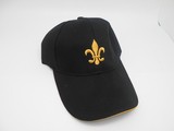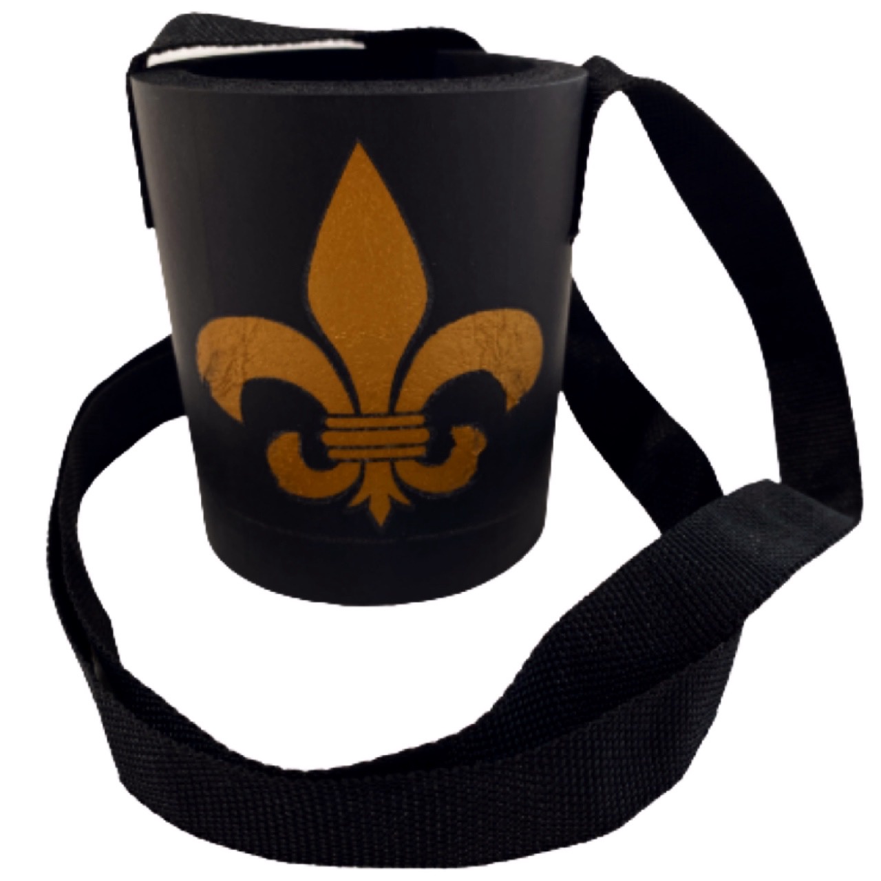 Black foam can koozie on 42" weaved lanyard with gold fleur di lis logo.