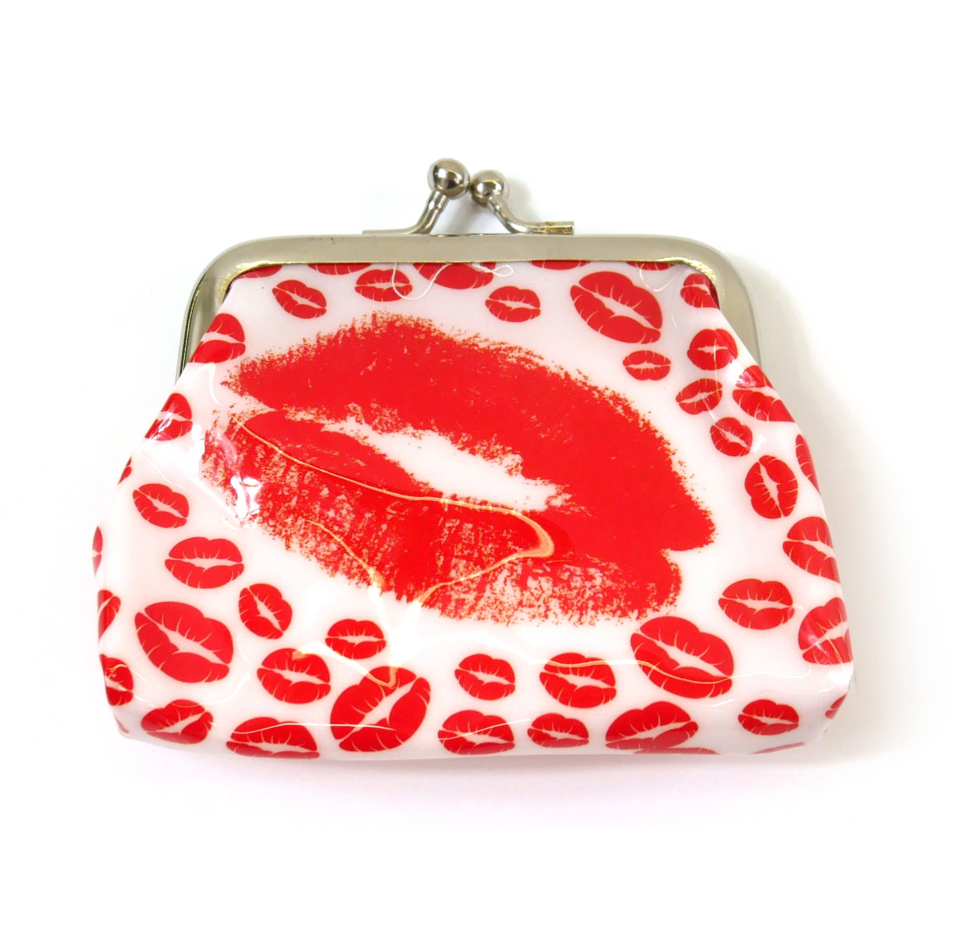 3" White coin purse with metal clasp and multiple red lips logo.