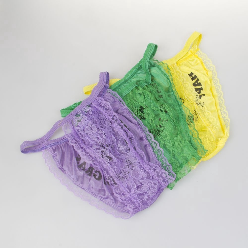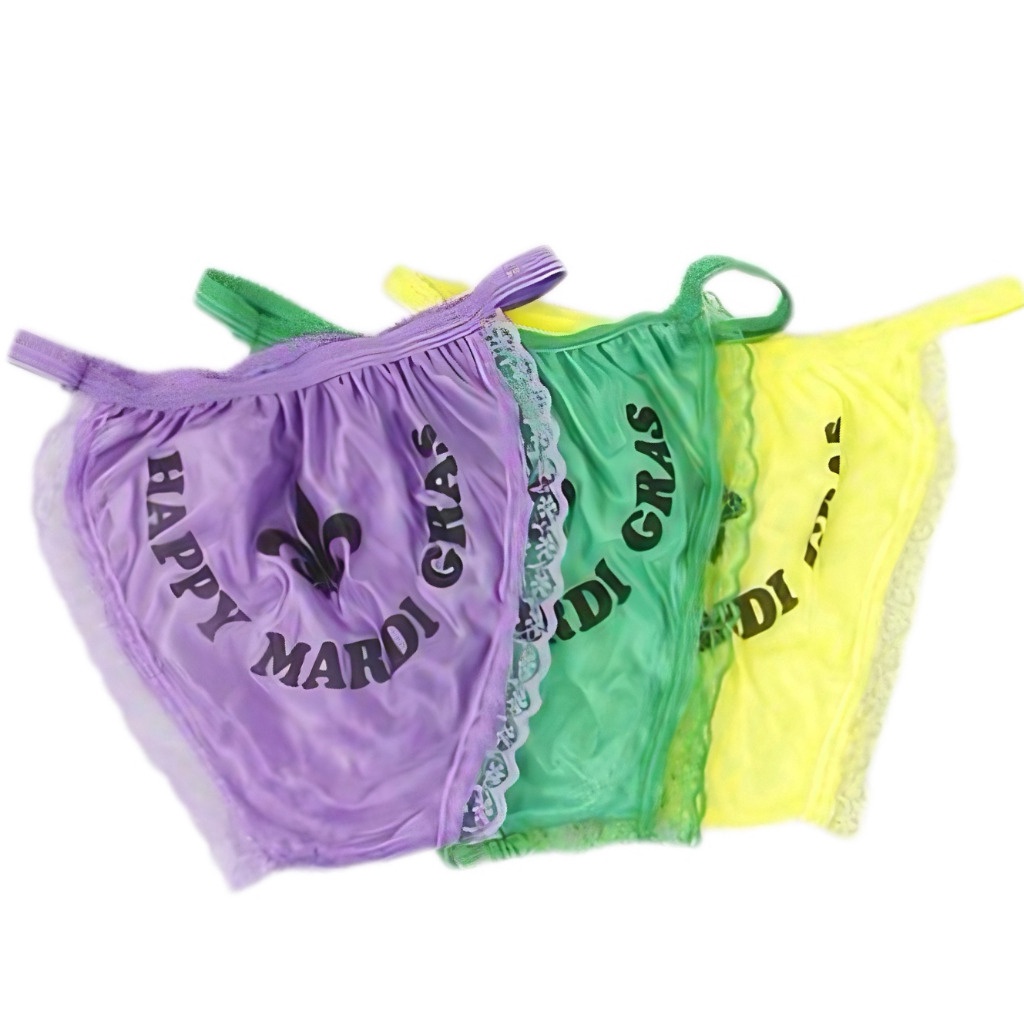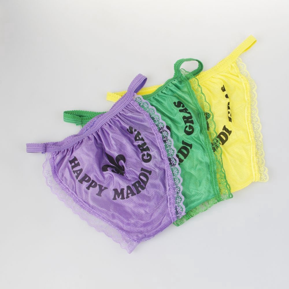 Purple, green and gold panties with happy mardi gras logo