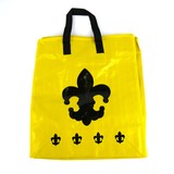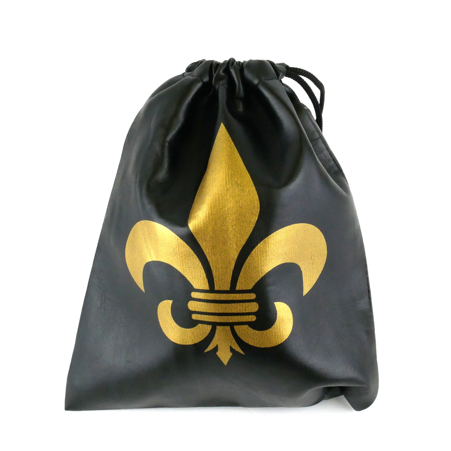 10" faux leather drawstring bag, Black with gold fleur di lis logo
