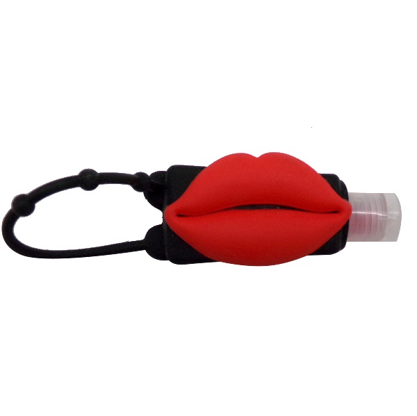 1oz Variety scented hand sanitizer in a black reusable rubber sleeve with red lip logo