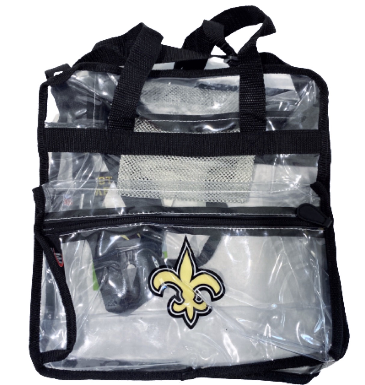 1'x1'x5" Clear plastic stadium tote with black and gold fleur di lis logo