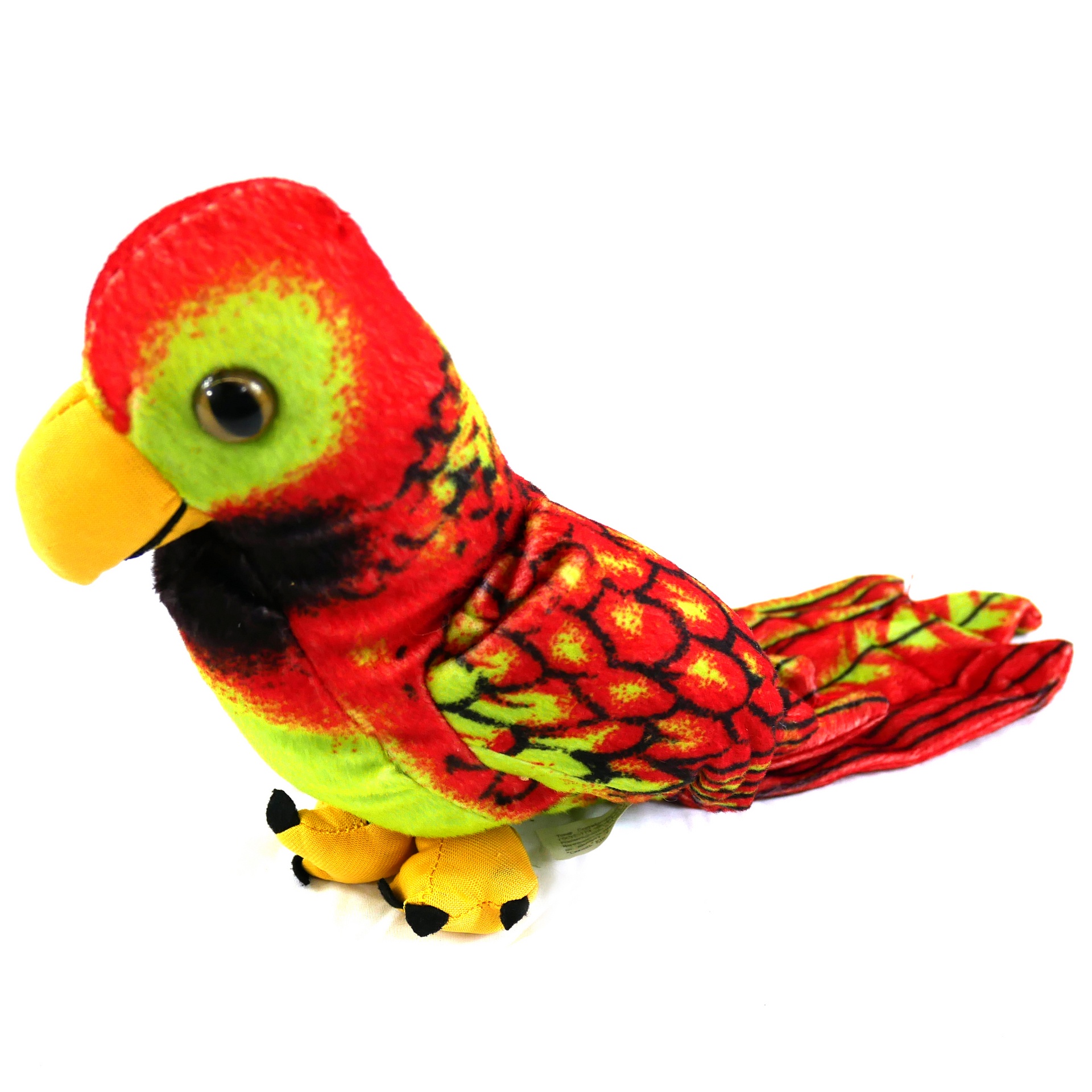 12" Plush parrot, red and green with 5" plummed tail feather.
