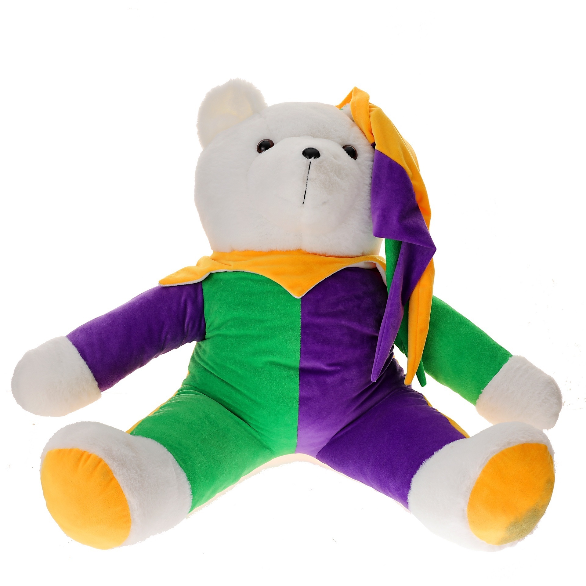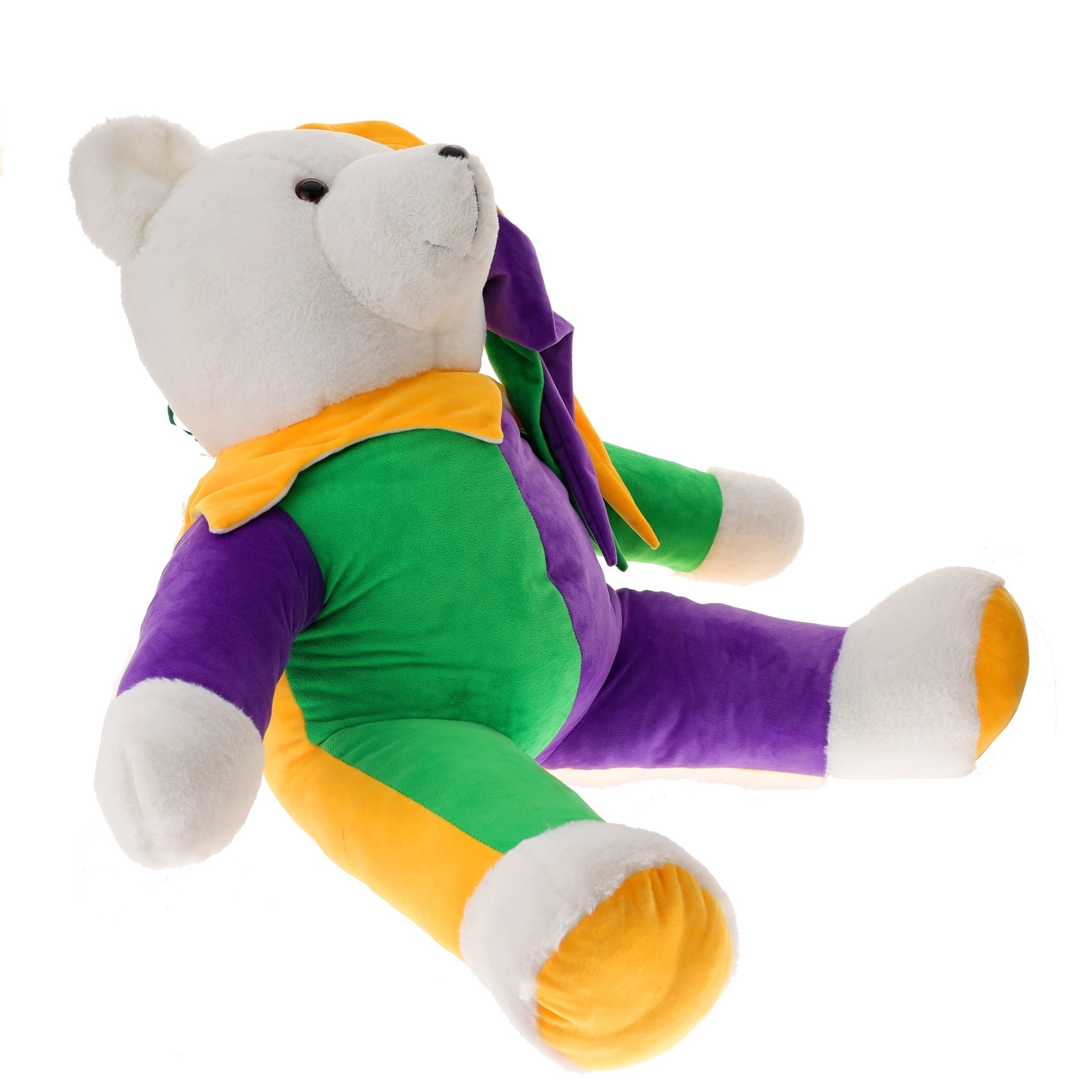42" White plush bear, wearing purple, green and gold jester outfit