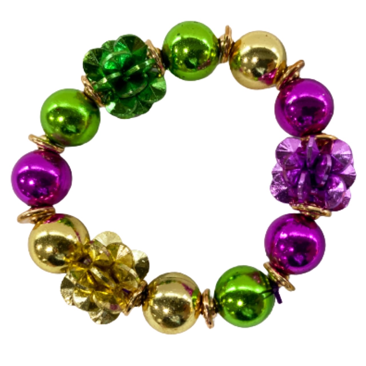 Metallic purple, green, and gold round and flower shaped beaded bracelet.