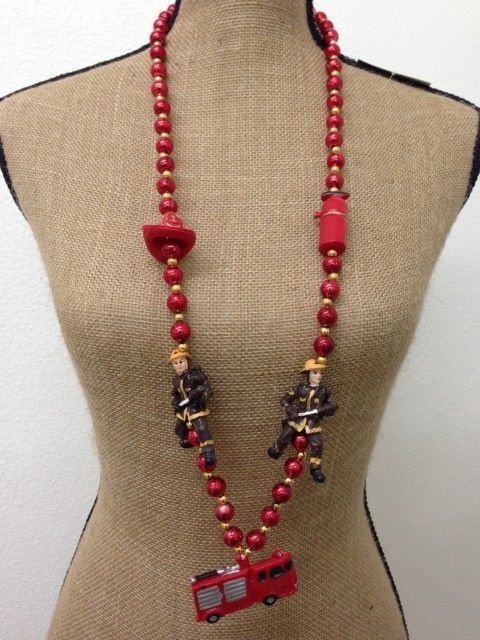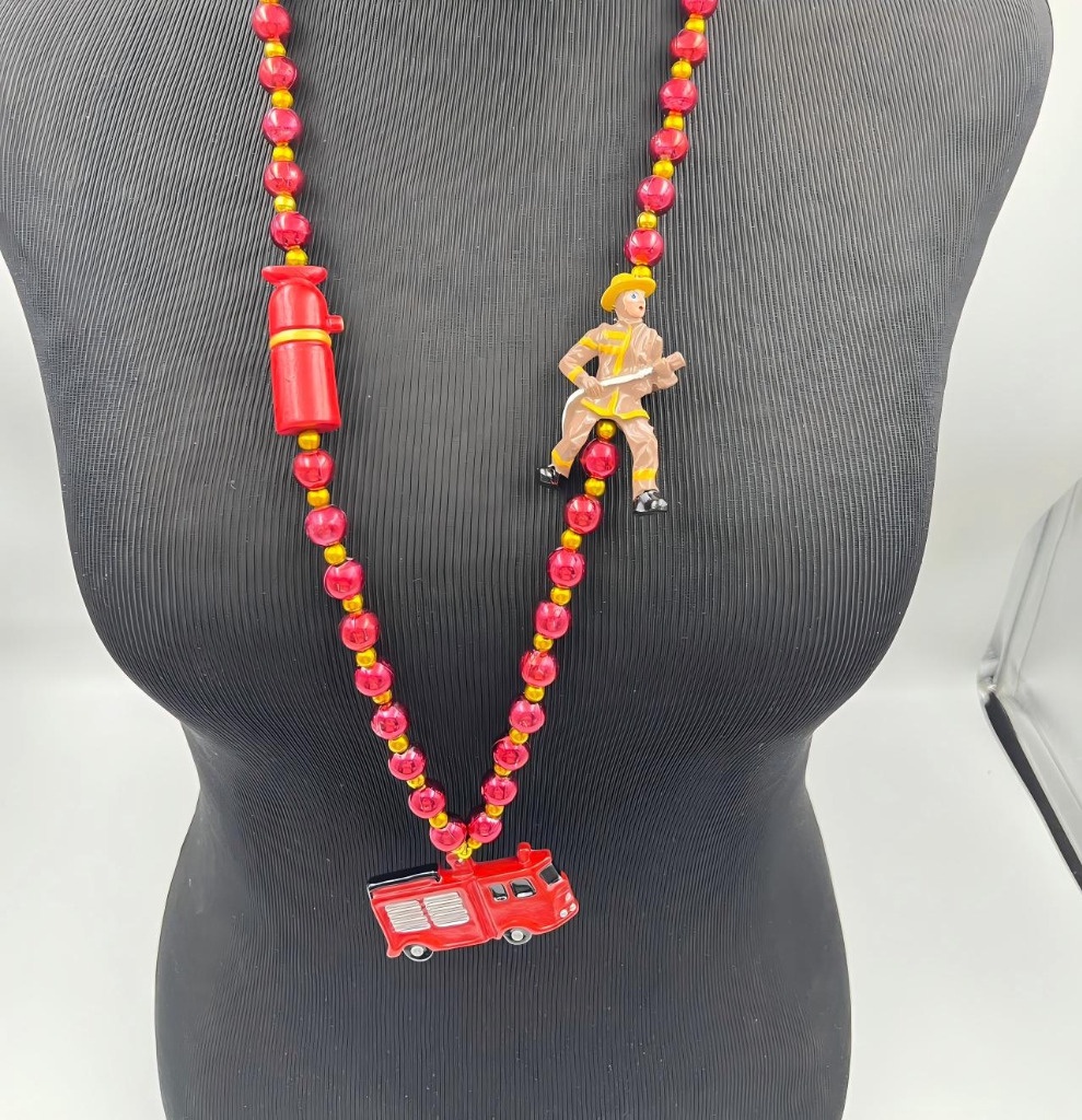 Red fire truck medallion with 2 fireman accents, a fire extingusher and fire hat accent on red and gold beads
