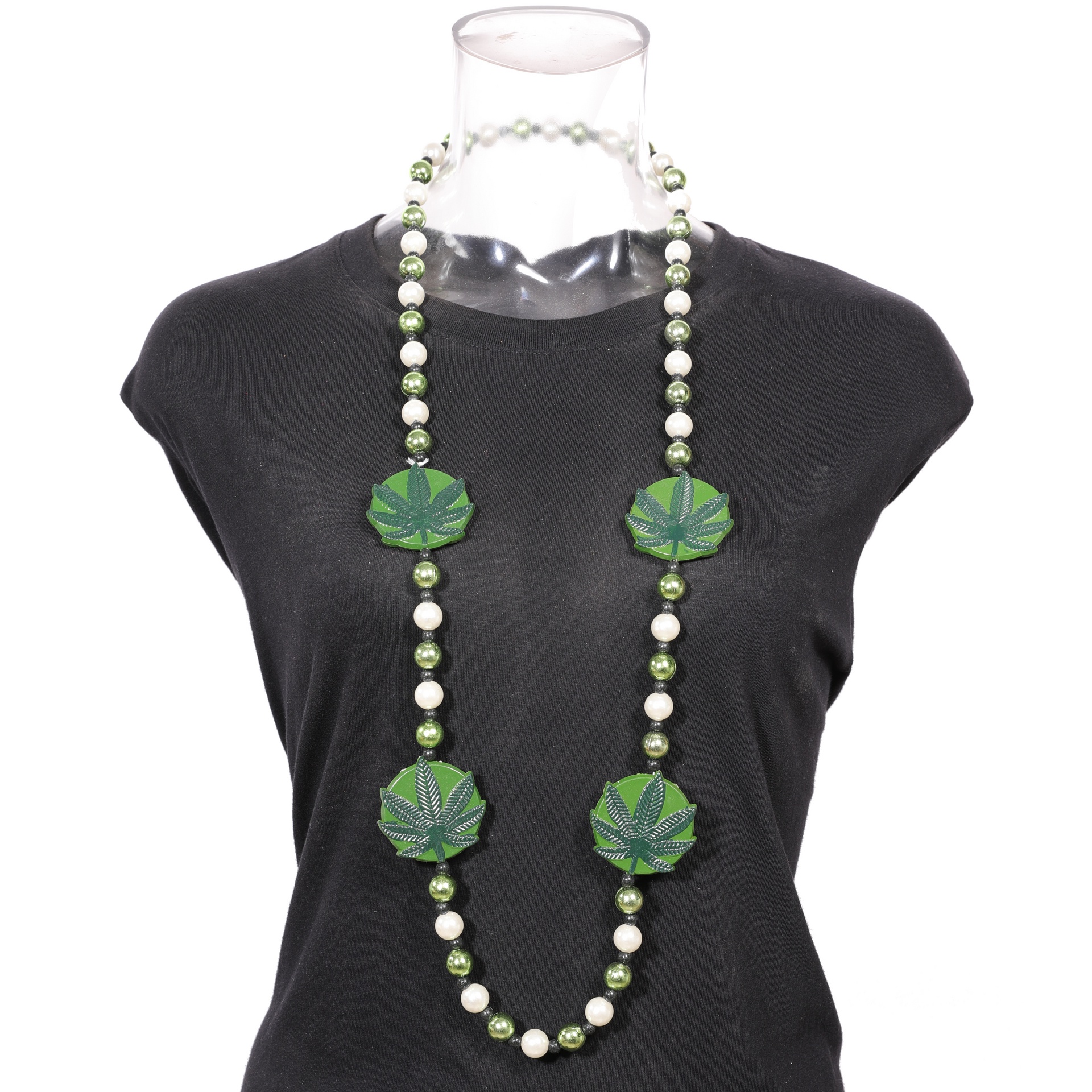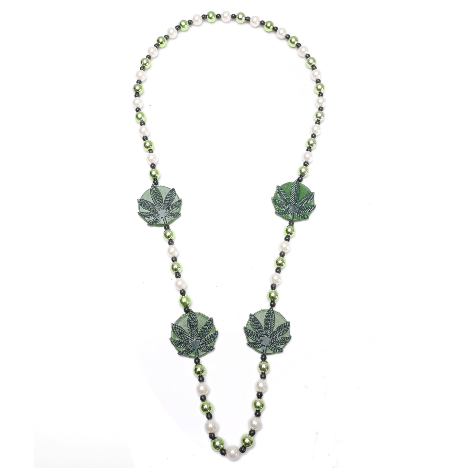 4 pc Dark green Marijauna Leaf medallions on green and white beads