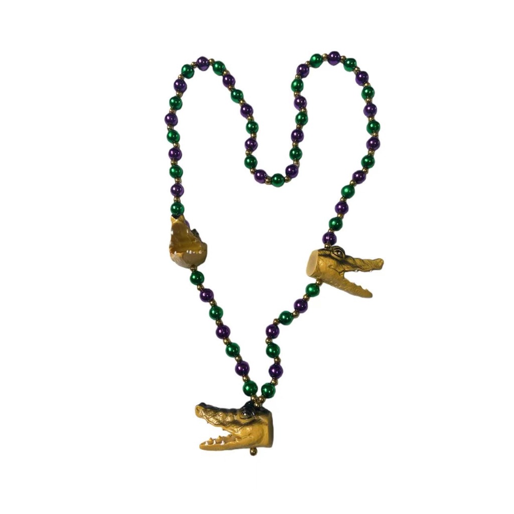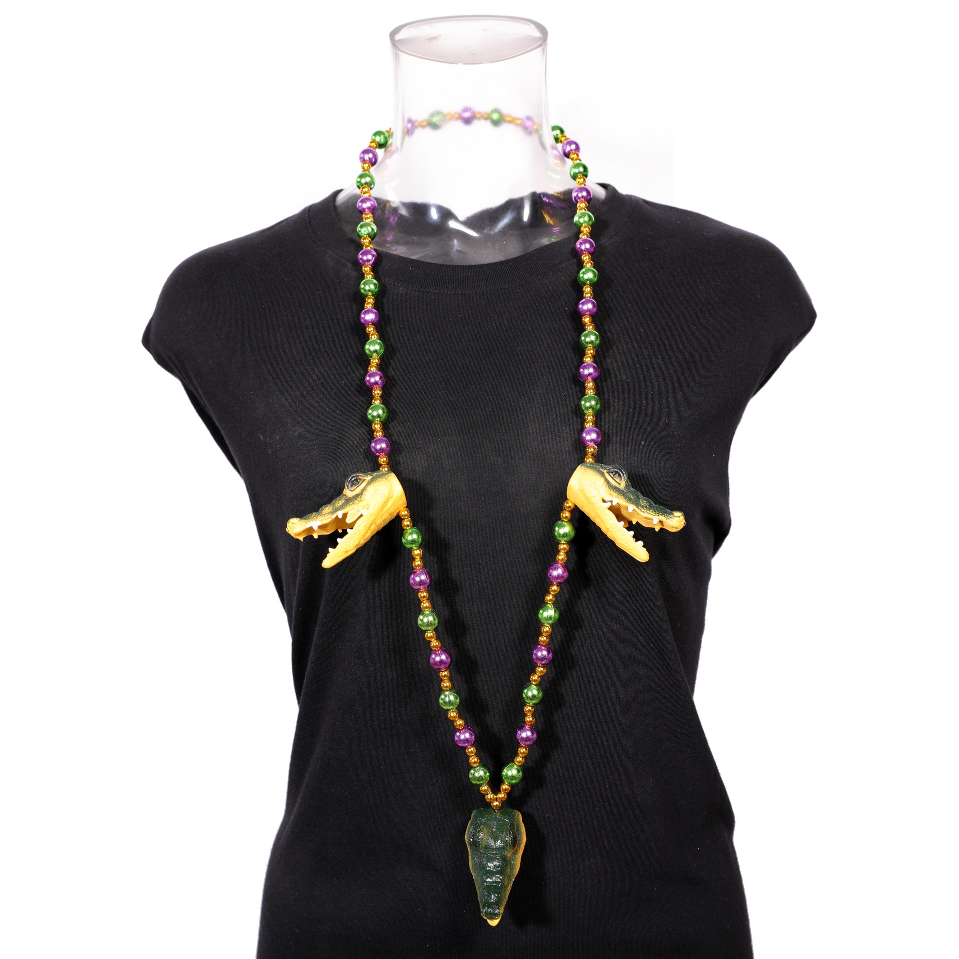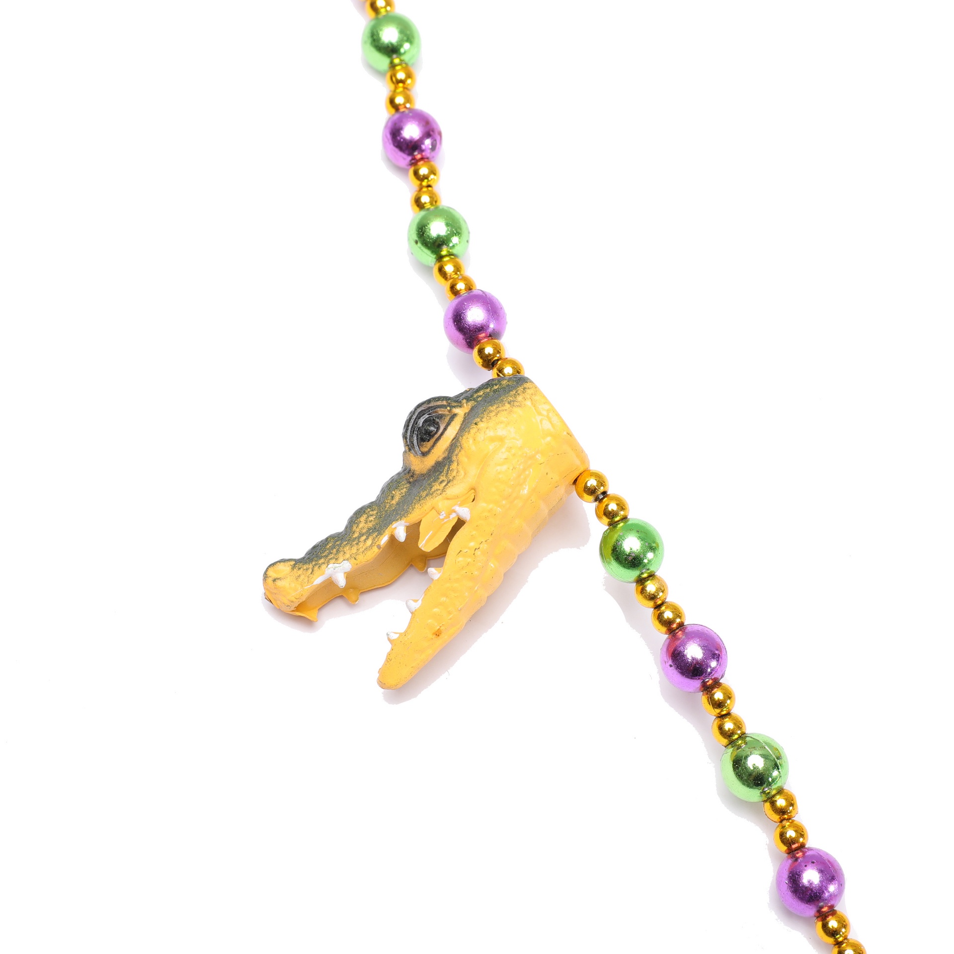 3 pc Green open mouth gator head on pearl, purple, green and gold beads